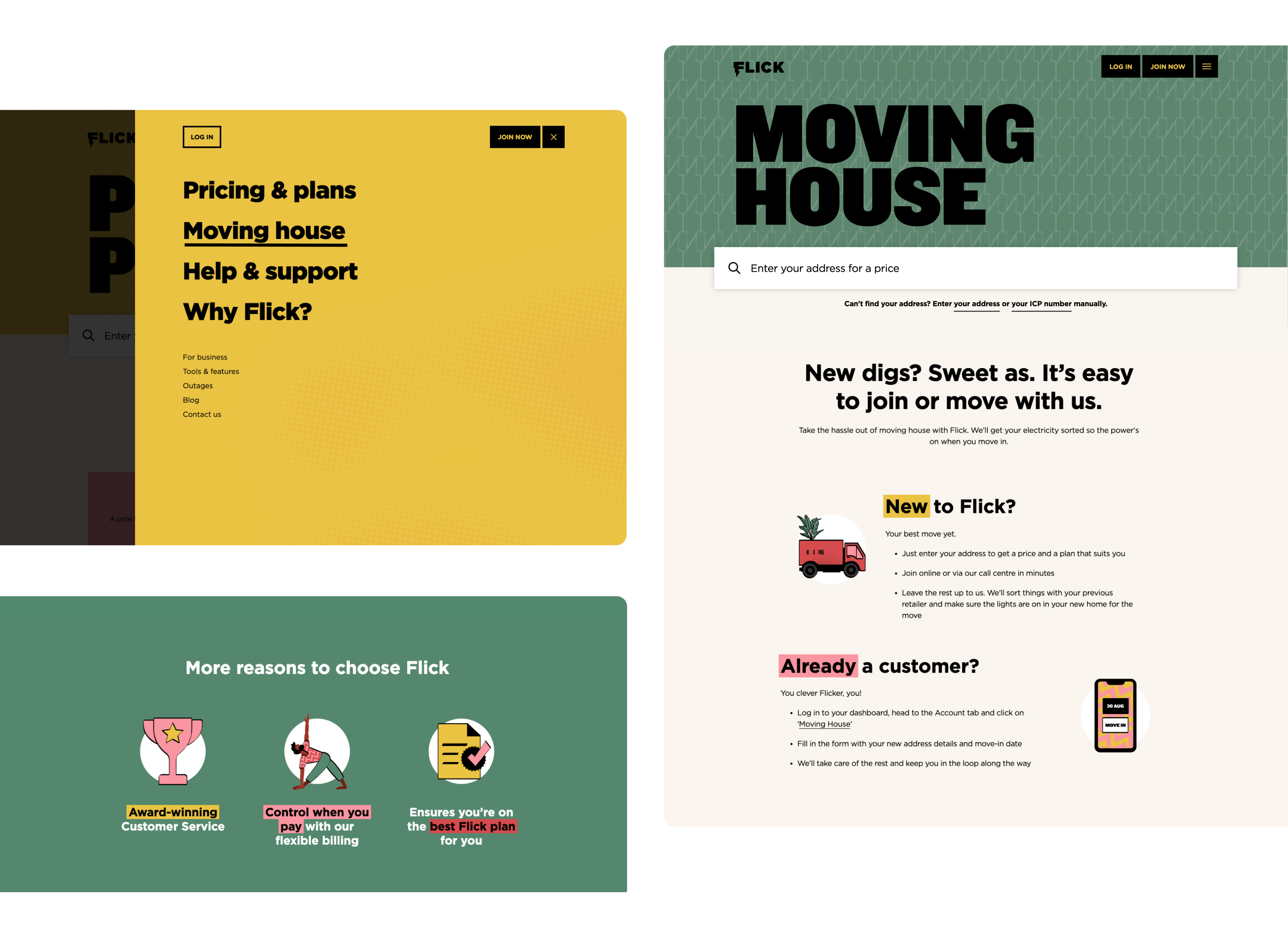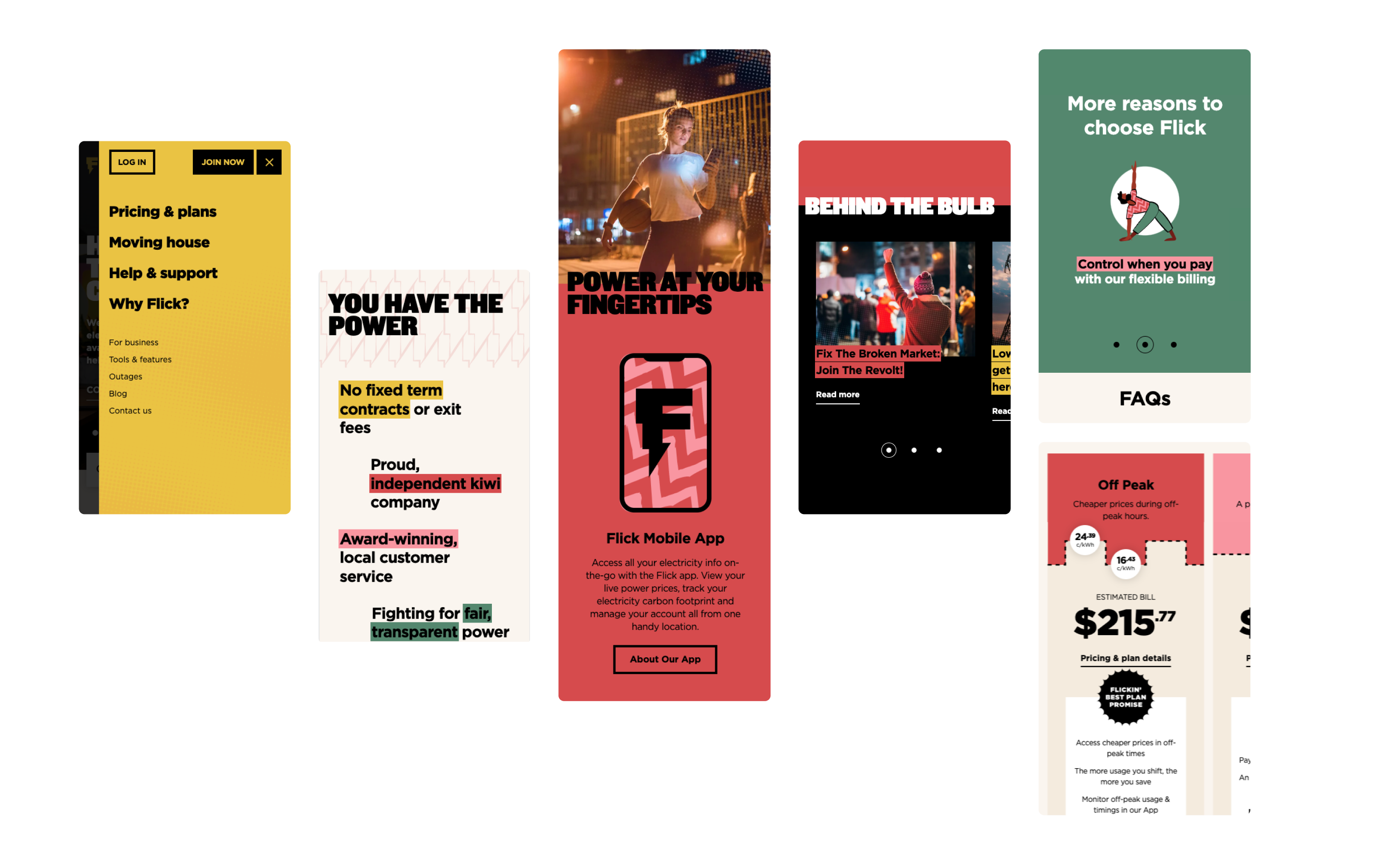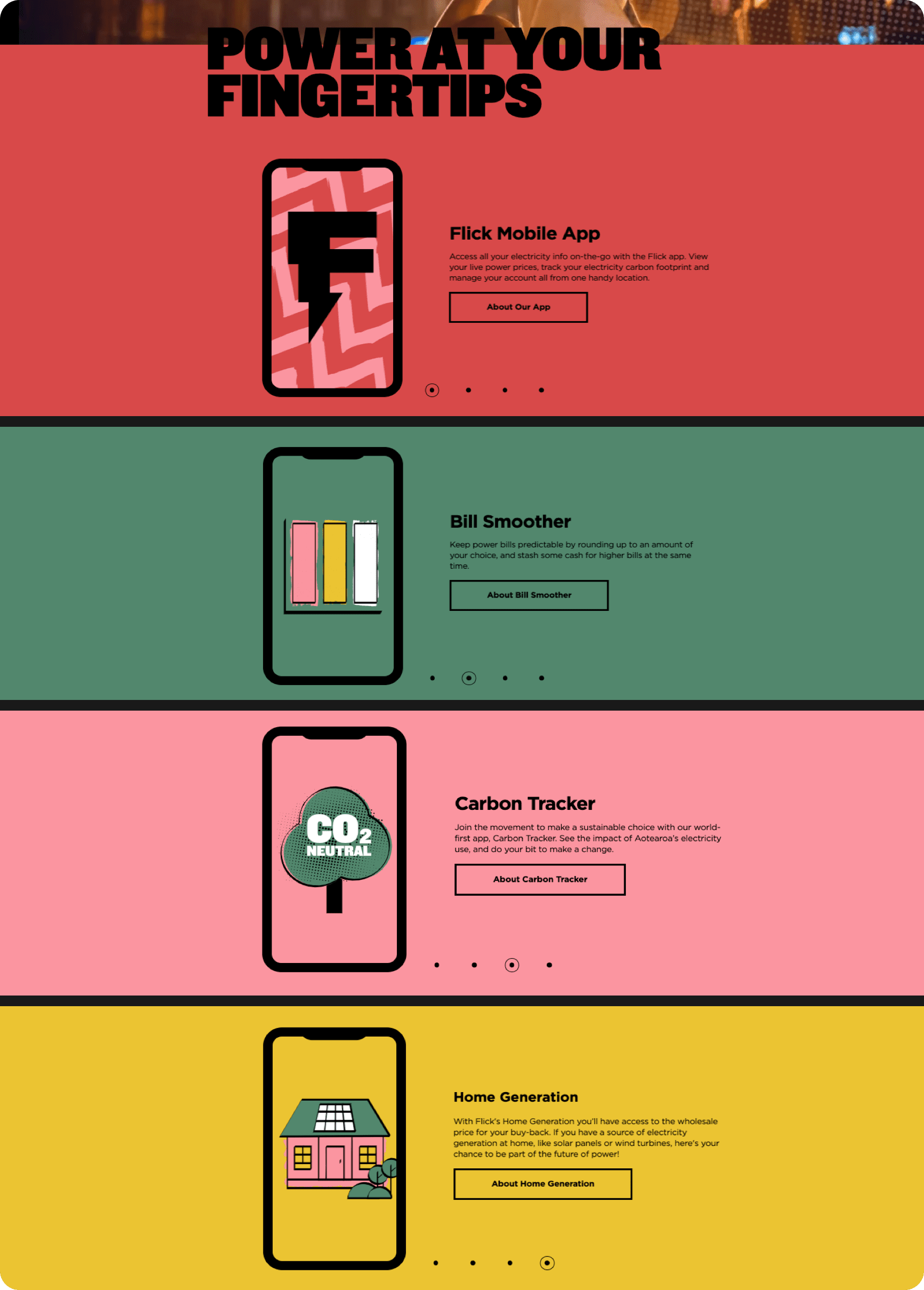 Flick sees itself as an energy sector activist, so the rebrand and new site focussed on positioning Flick as a champion for change and better value. During the rebrand, the research found that while more control over power usage was a huge benefit to customers, many Kiwi were strongly drawn to the fact that Flick was sticking it to the big guys.
